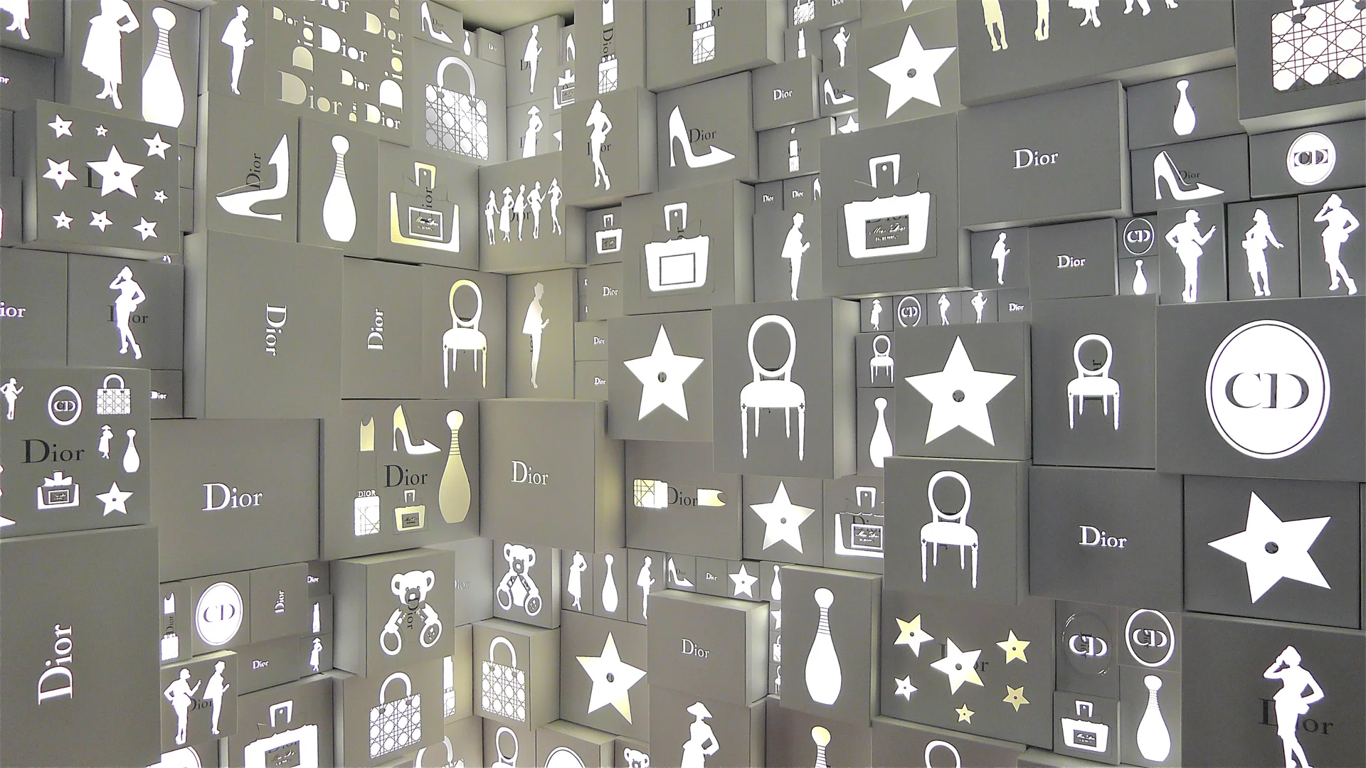 Sculpture éphémère mise en place pour la maison Dior dans les magasins Harrod’s à Londres. Réalisée à partir de boites Dior de toutes les tailles découpées au laser de motifs emblématiques de la Maison et rétro-éclairées.