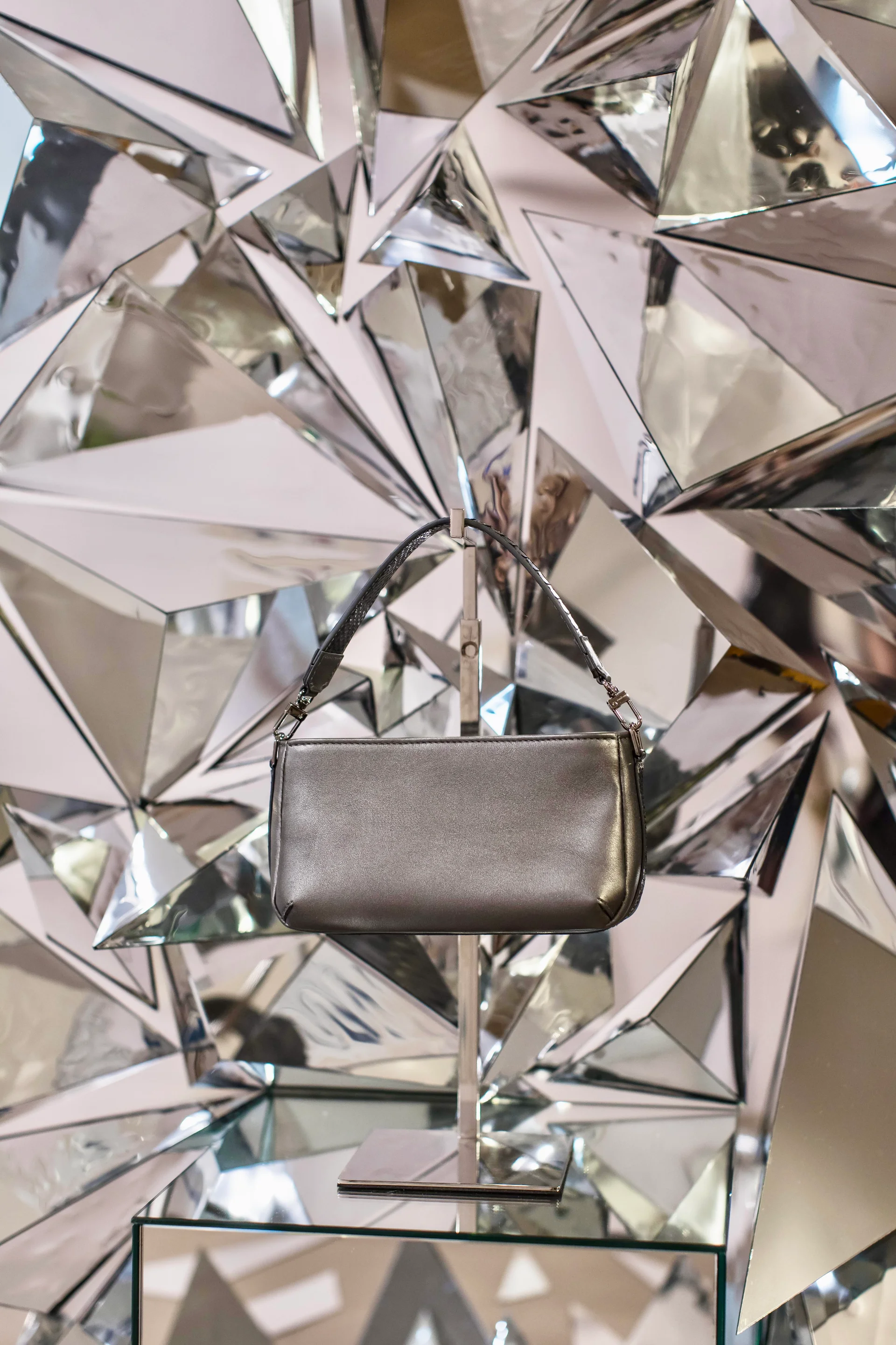 Installation d’une composition de modules pyramidales en miroir pour le showroom de l’enseigne de maroquinerie.